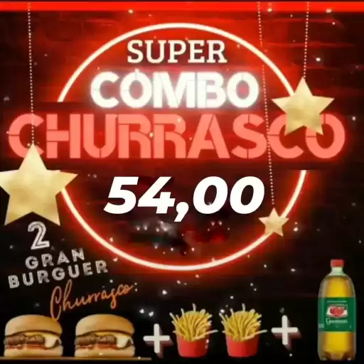 2 Gran Burguer Churrasco+2 batatas Fritas+1 Refrigerante de 1 Litro. Enviaremos molhos separados.